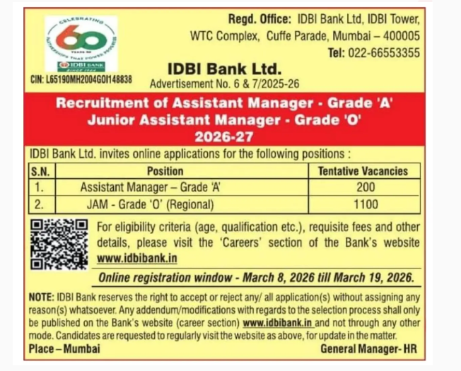 IDBI-Industrial Development Bank of India has released a recruitment notification to fill up 1300 vacancy of Assistant manager Grade A and Junior Assistant Manager Grade 0. Eligible graduates can apply online from 08.03.2026 to 19.03.2026. Below we have given information about the IDBI Bank recruitment 2026. This recruitment provides a major opportunity for aspirants looking to secure a stable job in the banking industry.