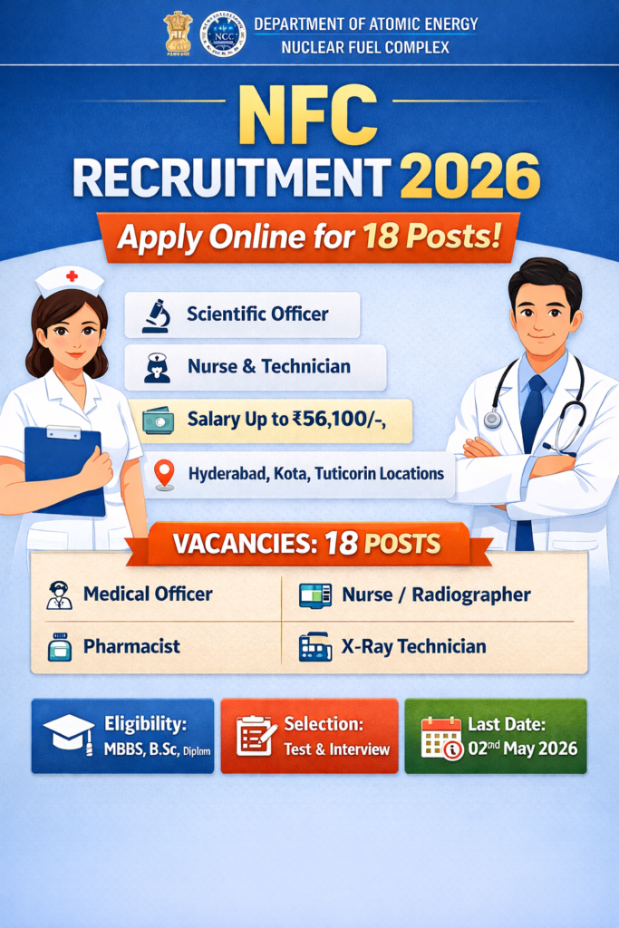 The Nuclear Fuel Complex (NFC), under the Department of Atomic Energy, Government of India, has officially released the NFC Recruitment 2026 Notification (Advt No: NFC/01/2026). This is a great opportunity for candidates looking for central government jobs in the medical and technical fields.